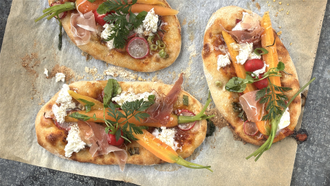 Belag: Öl und Knoblauch verrühren. Teigränder damit bestreichen. Pinsa mit der Tomatensauce dünn bestreichen, dabei einen Rand von 1-2 cm frei lassen. Bundzwiebeln, Rüebli, Radieschen, Tomaten und Rosmarin darauf verteilen.