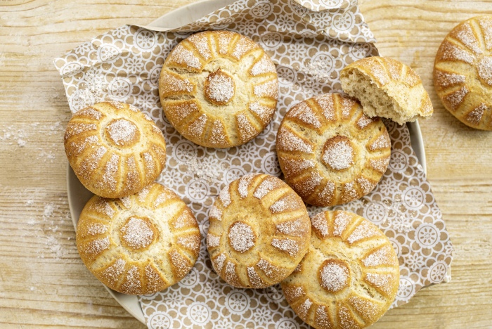 Formen: Den Teig in 12-15 Teile schneiden, diese zu Brötchen formen und auf das vorbereitete Blech legen. Zugedeckt 10-20 Minuten aufgehen (stückgaren) lassen, mit wenig Mehl bestäuben, mit dem Apfelspaltenschneider prägen und nochmals kurz aufgehen lassen.