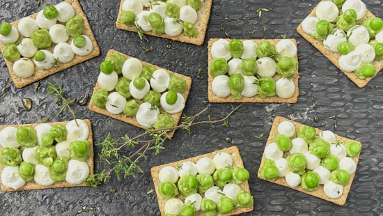 Kurz vor dem Servieren Knäckebrötchen auf einer Platte auslegen. Ricotta- und Erbsli-Masse darauf spritzen, mit Thymian und Honig garnieren und frisch servieren.