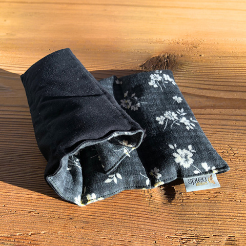 UrDinkel-Körnerkissen Dunkelgrau Blumen, Rückseite schwarz uni
