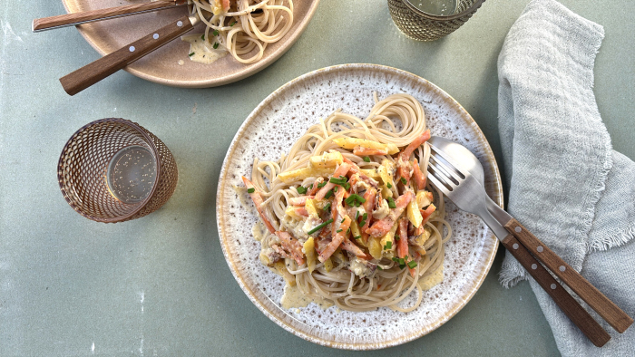 PureSpelt Spaghetti with Carrot and Bacon Sauce