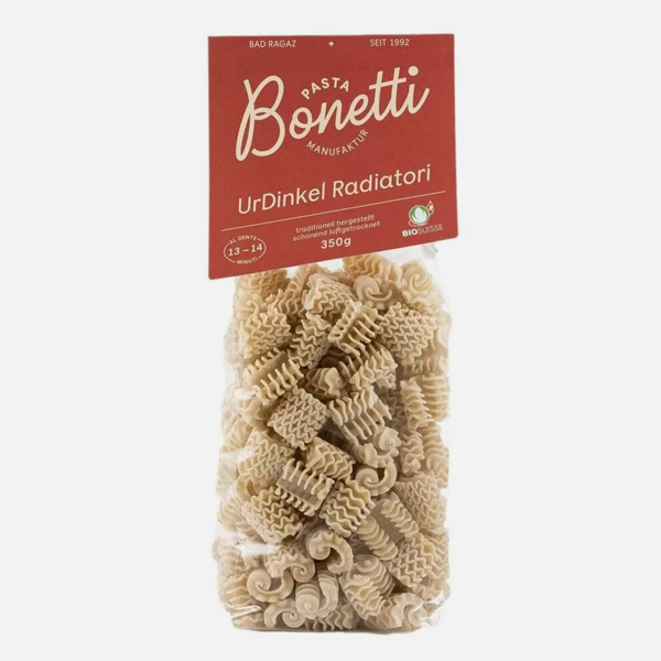 UrDinkel-Radiatori passen hervorragend mit einer Gemüse-Rahmsauce oder zu Fleischragout.