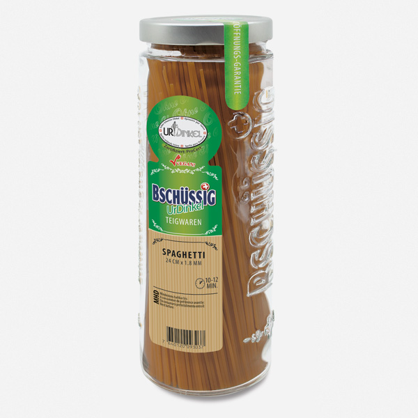 BSCHÜSSIG UrDinkel-Spaghetti im Relief-Glas