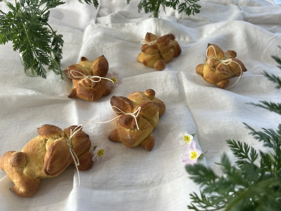 Façonnage: Diviser la pâte en 10 à 12 portions. Former des petits pains et laisser reposer pendant 20 à 30 minutes. Former des petits lapins, inciser les petites jambes et repliez-les vers l'arrière. Découper les oreilles et placez-les sur le dessus de la tête et attachez-les avec de la ficelle de cuisine. Ajouter les petites pattes et la petite queue (voir aussi la vidéo). Déposer les petits lapins de Pâques avec suffisamment d’espace sur les plaques préparée. Laisser lever brièvement.
