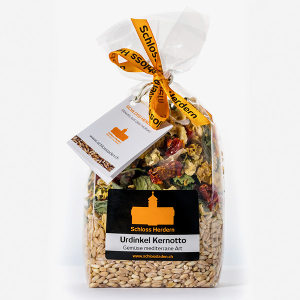 PurEpeautre Kernotto enrichi de légumes méditerranéens secs. En plat principal assaisonné de fromage râpé ou en accompagnement d'une saucisse de porc grillée.