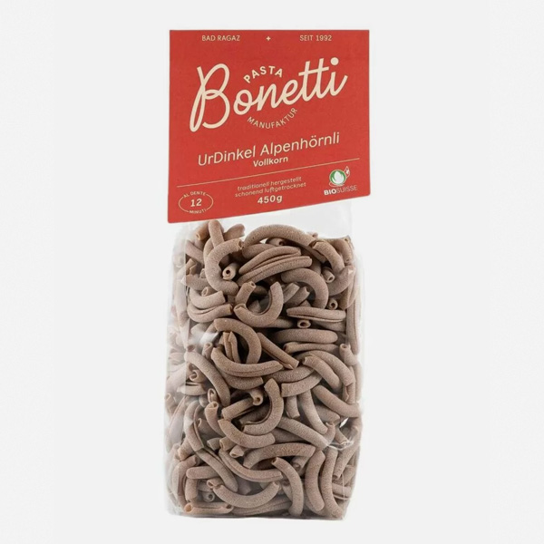 Vollkorn UrDinkel-Alphörnli: Die ganze Kraft des Dinkels! Von Natur aus ein hoher Mineral- und Eiweissgehalt! Als Hauptspeise mit geriebenem Käse und Apfelmus.