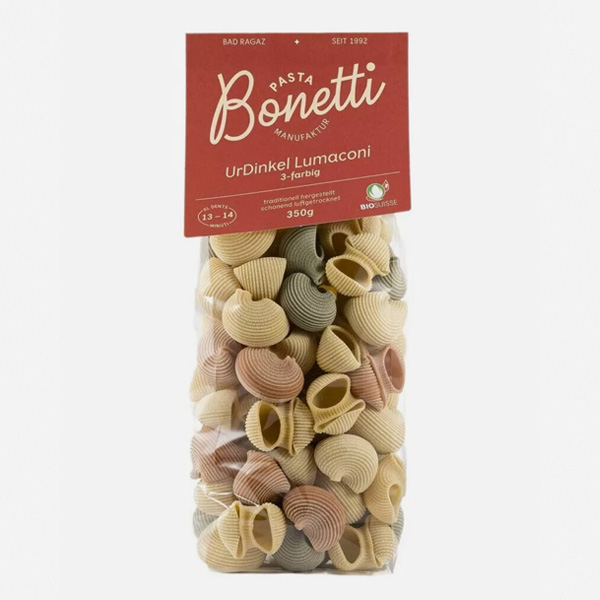 UrDinkel-Lumaconi 3-farbig, dazu passt z.B. hervorragend eine Pilzrahmsauce oder Rindsgeschnetzeltes!